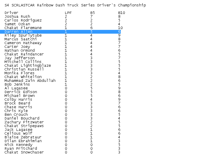 The Season 4 SCRL Rainbow Dash Truck Series Championship went to Zachary Fitzwater, the second straight the driver, and fourth overall in his career, and the first for his team owner, Dick Greenfield. Fitzwater had no last-place finish in the season, with his worst finish of the seaosn being a 35th - coming at Gateway. Congratulations to Fitzwater and the Greenfield Racing team for having a great year and making history in the SCRL.